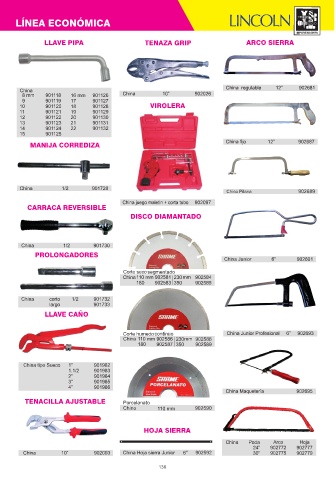 LÍNEA ECONÓMICA LLAVE PIPA TENAZA GRIP ARCO SIERRA VIROLERA MANIJA CORREDIZA Chino Pilana 902689 CARRACA REVERSIBLE DISCO DIAMANTADO PROLONGADORES segmentado LLAVE CAÑO continuo TENACILLA AJUSTABLE Porcelanato Chino 110 mm 902590 HOJA SIERRA 6" 136